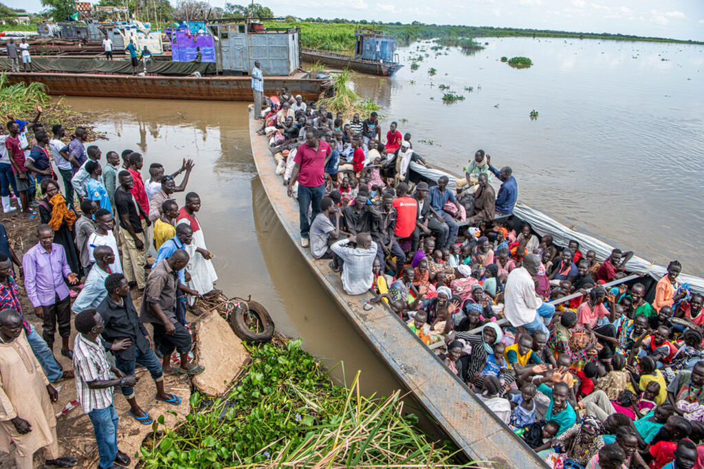 | Une barge quitte un quai à Renk, dans l'État du Haut-Nil, au Soudan du Sud, transportant des centaines de rapatriés sud-soudanais qui ont fui le conflit au Soudan. |