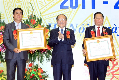 | Le président de l'AN vietnamienne Nguyên Sinh Hùng (centre) entouré de responsables du Comité des affaires ethniques fraîchement honorés, le 23 septembre à Hanoi. |