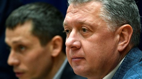 | Le président de la Fédération russe d'athlétisme, Dmitry Shlyakhtin, lors d'une conférence de presse, le 21 février 2017 à Moscou |
