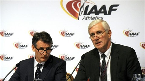 | Le président de l'IAAF Sebastian Coe (gauche) et le Norvégien Rune Andersen. |