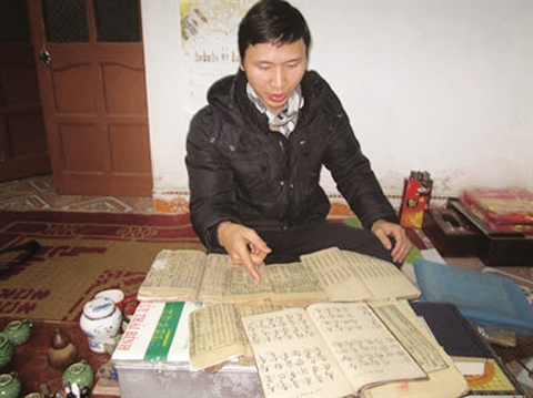 | Nguyên Thê Anh présente plusieurs des livres anciens de sa lignée. |
