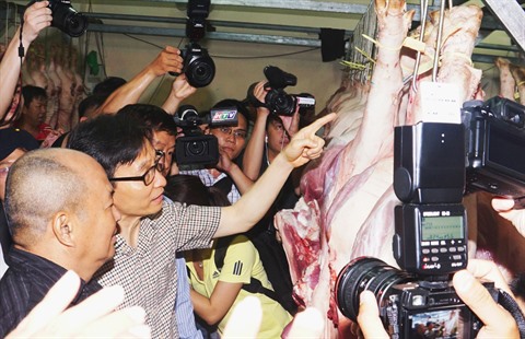 | Le vice-Premier ministre Vu Duc Dam (2e à gauche) inspecte le commerce de la viande crue dans le marché de gros de Binh Diên à Hô Chi Minh-Ville. |