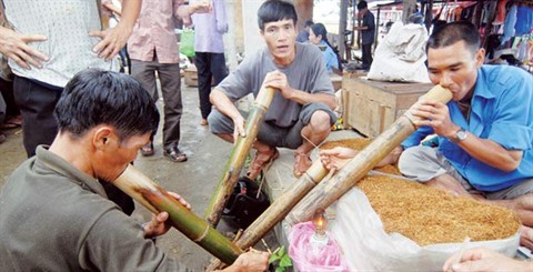 | Hommes réunis au coin de la rue pour fumer du tabac de jardin (Nicotiana rustica) avec des tubes de bambou. |