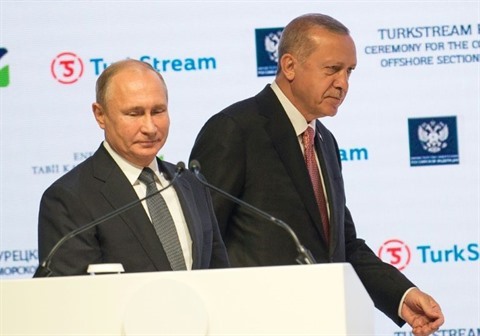 | Le président turc Tayyip Erdogan (droite) et son homologue russe Vladimir Poutine à une cérémonie sur le tronçon sous la mer du gazoduc Turkish Stream, en novembre 2018 |