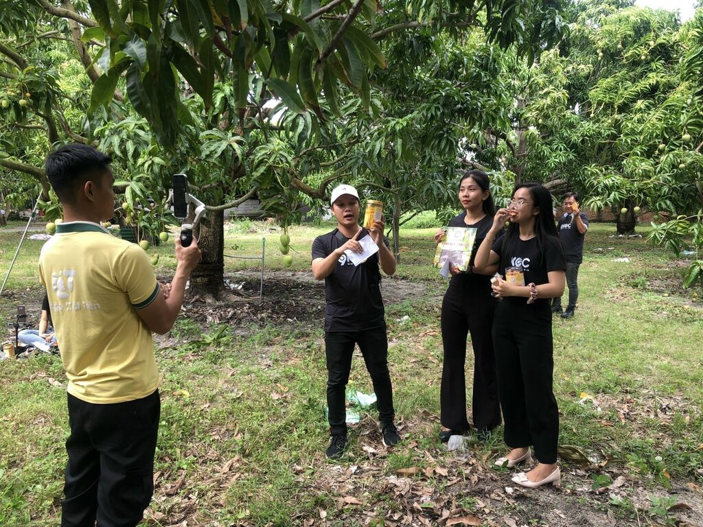 | Un groupe de jeunes de la province de Khanh Hòa (Centre) réalise un livestream avec une célébrité pour vendre des spécialités locales dans un verger de manguiers. |
