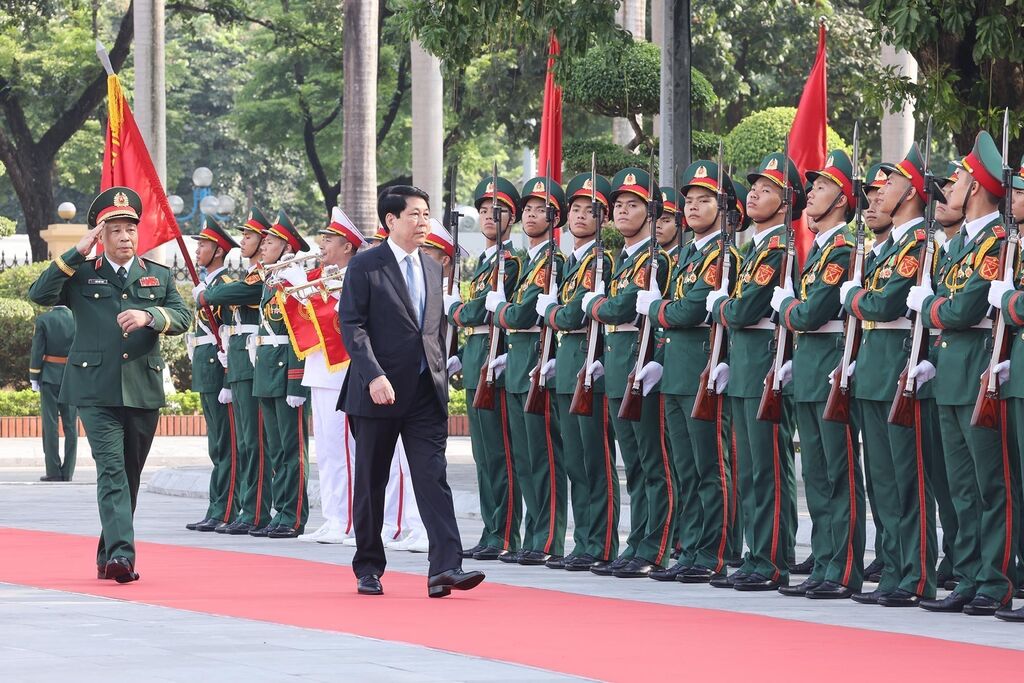 | Le président Luong Cuong passe en revue la garde d'honneur. |