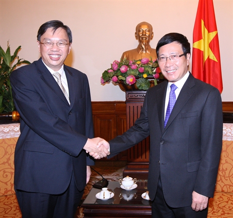 | Le vice-PM et ministre vietnamien des AE, Pham Binh Minh (droite), et le secrétaire permanent des AE de Singapour, Chee Wee Kiong, le 17 août à Hanoi. |
