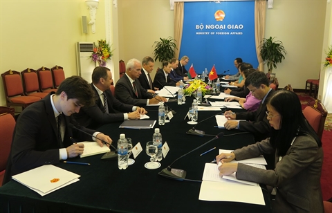 | Séance de travail entre le vice-ministre vietnamien des Affaires étrangères Bùi Thanh Son et son homologue biélorusse Vladimir Rybakov, le 28 juin à Hanoi. |