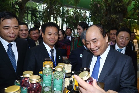 | Le Premier ministre Nguyên Xuân Phuc (1er à droite) observe les produits à base du ginseng Ngoc Linh lors de l’exposition. |