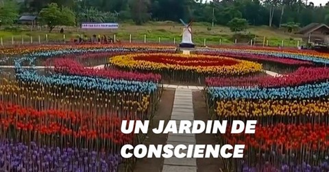 | Le jardin de "tulipes" de près de 30.000 bouteilles en plastique aux Philippines. |