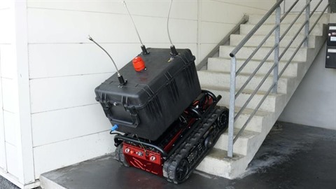 | La société française Shark Robotics a conçu un module de décontamination qui s'imbrique sur son robot Rhyno Protect pour pulvériser du désinfectant dans les hôpitaux ou les gares, par exemple. |