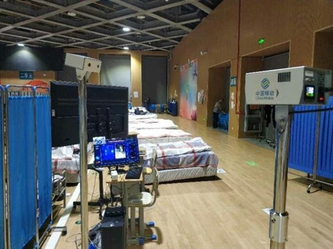 | Photo transmise le 7 avril par la société CloudMinds, qui montre un robot capable de prendre la température des patients, dans un hôpital temporaire à Wuhan, en Chine, début mars. |