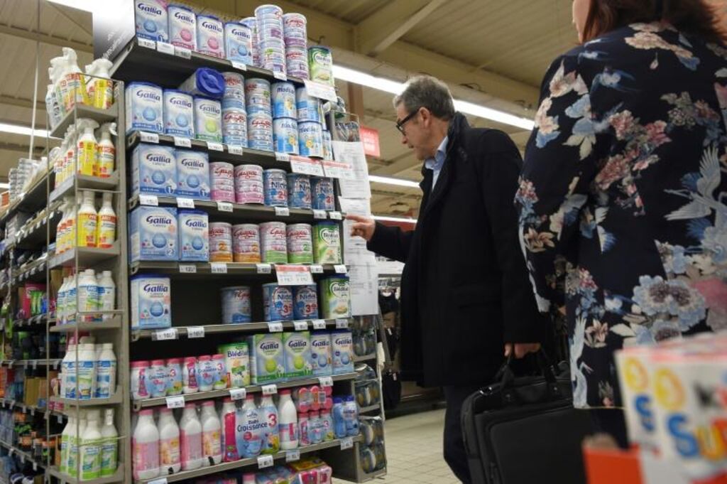 | Un inspecteur contrôle des produits laitiers pour bébés dans un supermarché à Orléans, le 11 janvier 2018. |