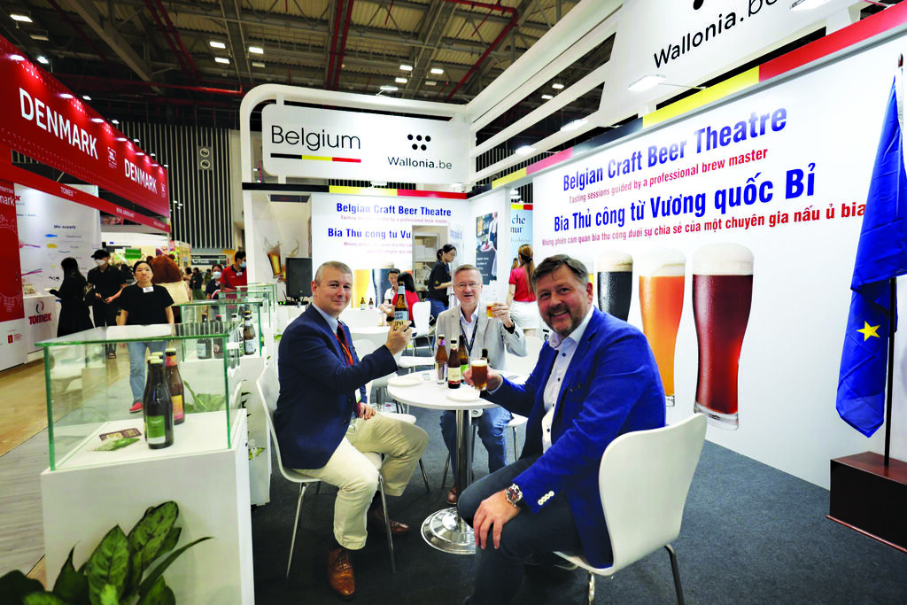 | Pavillon de l’AWEX à l’exposition “Food & Hotel Vietnam”, en décembre 2022, avec l’ambassadeur de Belgique au Vietnam, Karl Van den Bossche (gauche), Jean-Pierre Muller (centre), et Olivier Lenglet, CEO de Central Retail. |