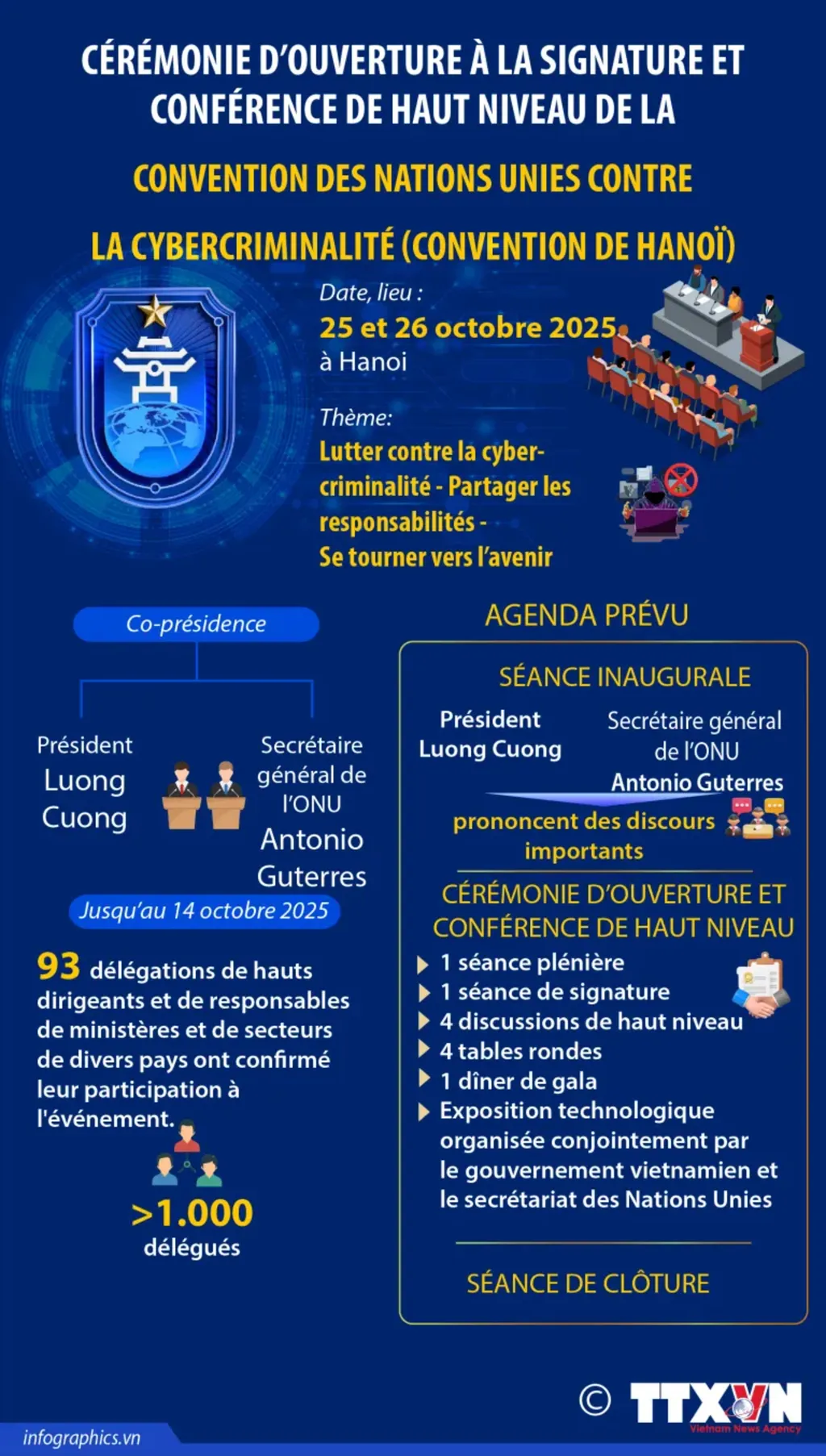La présence du secrétaire général des Nations unies, António Guterres, souligne l'importance de cet événement. En marge de la cérémonie de signature officielle, un programme riche est prévu, incluant des tables rondes de haut niveau animées par les dirigeants des ministères vietnamiens concernés et l'ONUDC ; 38 ateliers et discussions spécialisées, et plus de 20 stands d'exposition.