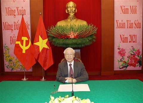 | Le secrétaire général du Parti et président de la République, Nguyên Phu Trong, lors d'une conservation téléphonique avec le président du Parti Russie unie et vice-président du Conseil de sécurité de la Russie, Dmitri Medvedev, le 8 février. |
