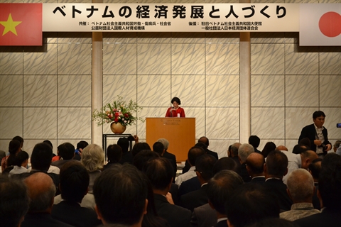 | La vice-présidente de l'AN vietnamienne, Nguyên Thi Kim Ngân (debout), présente une allocution à l’Assemblée mondiale pour les femmes 2015 à Tokyo. |