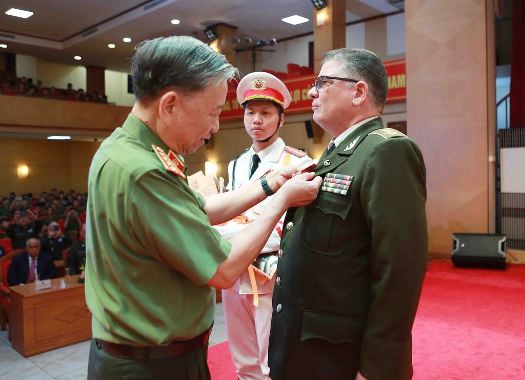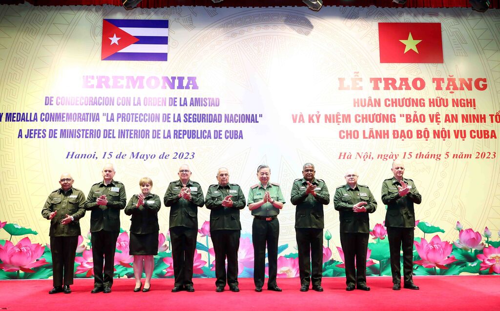 | Le ministre de la Police, Tô Lâm (gauche), attribue l'Insigne de l'amitié au ministre cubain de l'Intérieur, Lázaro Alberto Álvarez Casas, le 15 mai. |