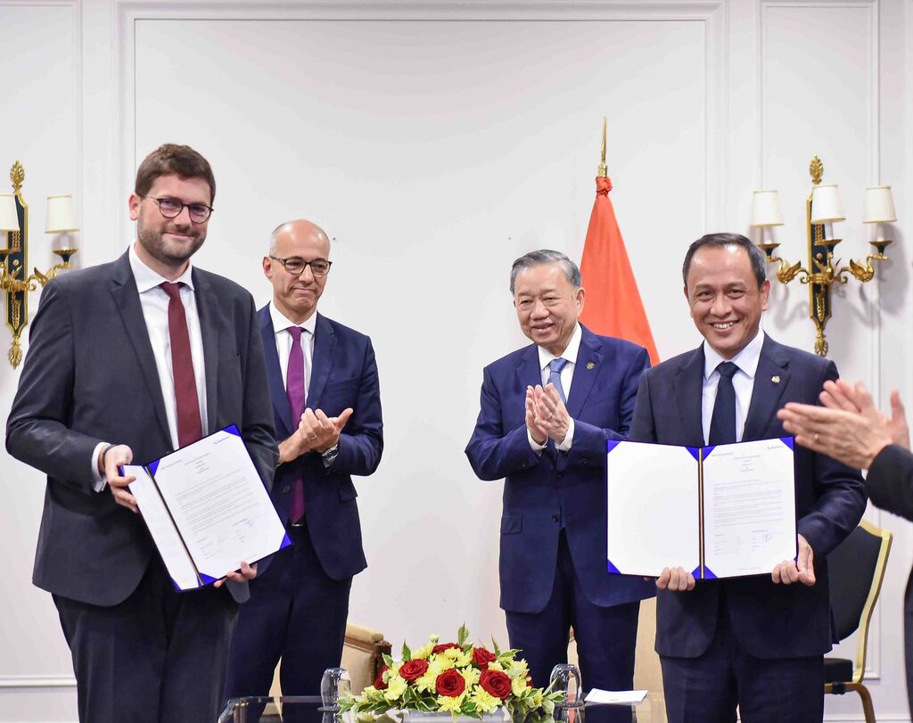 | Le secrétaire général du Parti communiste du Vietnam et président vietnamien, Tô Lâm (2e à droite), à la signature du document de coopération entre Vietnam Airlines et Safran Seats. |