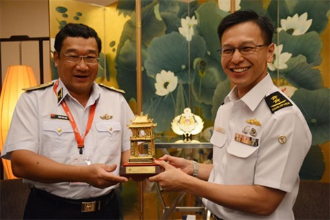 | Le commandant de la Marine vietnamienne, Pham Hoài Nam (gauche), offre un cadeau à son homologue singapourien, Lai Chung Han, le 14 mai à Singapour. |