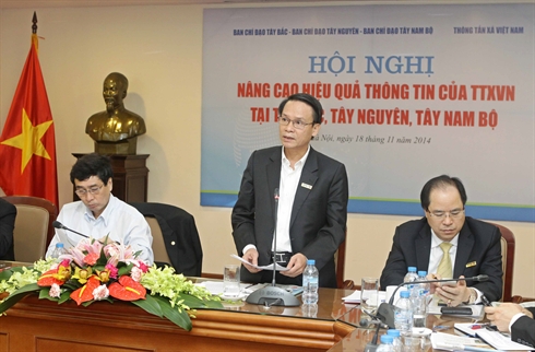 | Le directeur général de l'Agence Vietnamienne d'Information (VNA), Nguyên Duc Loi, prend la parole à la conférence consacrée à l'amélioration des informations de la VNA dans le Nord-Ouest, les hauts plateaux du Centre et le Sud occidental, |