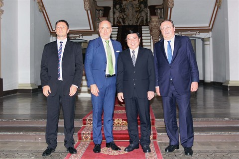 | Le maire de Hô Chi Minh-Ville, Nguyên Thành Phong (2e à droite) et le secrétaire d’État adjoint auprès du ministre hongrois des Affaires étrangères et du Commerce, Bus Szilveszter, le 12 octobre. |