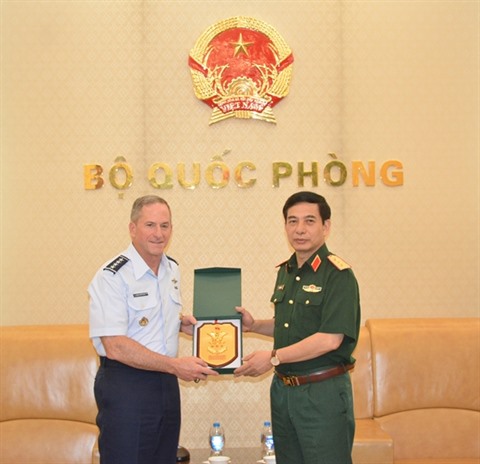 | Le général Phan Van Giang (droite), chef de l'état-major général de l'Armée populaire du Vietnam et le général David Goldfein, commandant de la force aérienne des États-Unis. |