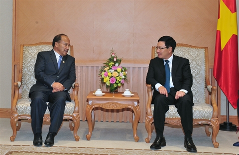 | Le vice-Premier ministre et ministre des Affaires étrangères, Pham Binh Minh (droite), a reçu le ministre népalais du Commerce, Romi Gauchan Thakali, à Hanoi le 9 mars. |