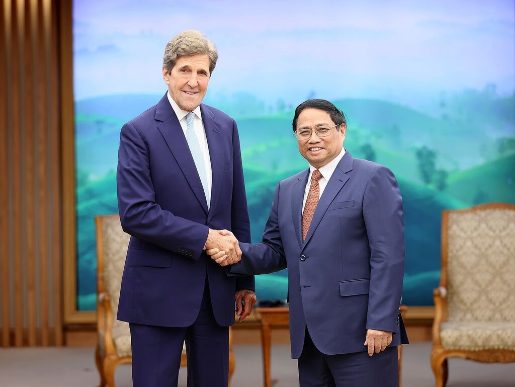 Pour sa part, John Kerry a déclaré que les États-Unis attachaient continuellement de l'importance aux relations avec le Vietnam ; soutenait le pays pour qu'il joue un rôle proactif dans la région et réponde aux enjeux internationaux, notamment le changement climatique. Il a hautement apprécié l’engagement du Vietnam à atteindre zéro émission nette d’ici 2050.