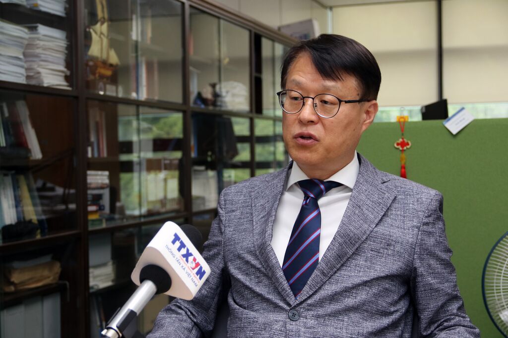 | Le professeur Choe Won Gi, directeur du Centre d'études sur l'ASEAN et l'Inde à l'Académie diplomatique nationale de République de Corée (Korea National Diplomatic Academy - KNDA), répond à une interview de la VNA. Photo : VNA/CVN |