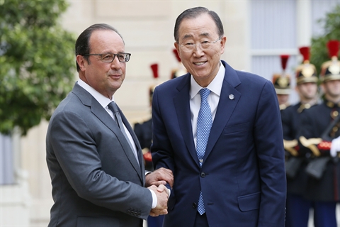 | François Hollande (gauche) et Ban Ki-moon, le 25 août à l'Élysée, Paris. |