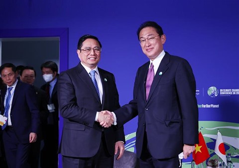 | Le Premier ministre Pham Minh Chinh (gauche) et son homologue japonais Fumio Kishida, le 2 novembre à Glasgow. |