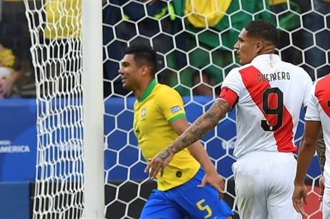 | Le joueur du Brésil, Casemiro (gauche), buteur lors de qualification en quarts de finale de la Copa América, le 22 juin à Sao Paulo. |