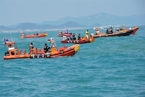 | Des secouristes cherchent des passagers disparus dans le naufrage du ferry Sewol au large de Jindo, le 20 avril |
