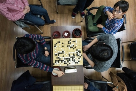 | Un élève place des pierres sur un plateau de go, à l'institut Lee Se-Dol à Séoul, en Corée du Sud, le 18 mars |