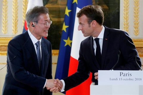 | Le présient français Emmanuel Macron (droite) et son homologue sud-coréen Moon Jae-in. |