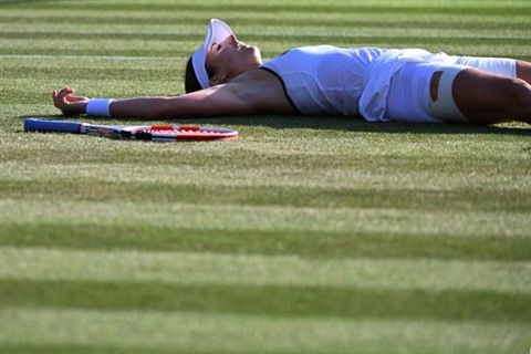 | La Française Alizé Cornet au sol à cause de sa blessure à la cuisse en huitièmes de finale de Wimbledon, le 4 juillet à Londres. |