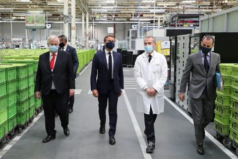 | Le président Emmanuel Macron (centre) visite l'usine Valeo d'Étaples dans le Pas-de-Calais, le 26 mai. |