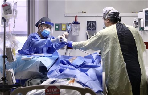 | Traitement d'un patient du COVID-19 à l'hôpital de Beverly à Montebello, en Californie (États-Unis), le 22 janvier. |