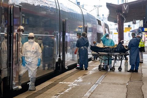| Des personnels soignants accompagnent un malade du Covid-19 devant être évacué par TGV médicalisé dans une autre ville, le 3 avril à Strasbourg. |