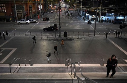 | Peu de passants et de circulation à l'heure de pointe à Melbourne, près de la gare de Southern Cross, le 30 juin. |