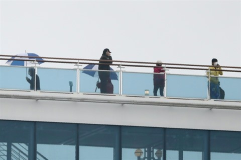 | Des passagers du Diamond Princess, en quarantaine dans le port japonais de Yokohama, le 16 février 2020. |