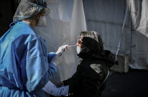 | Une soignante procède à un test au COVID-19 sur une femme dans le 17e arrondissement de Paris, le 30 mars. |