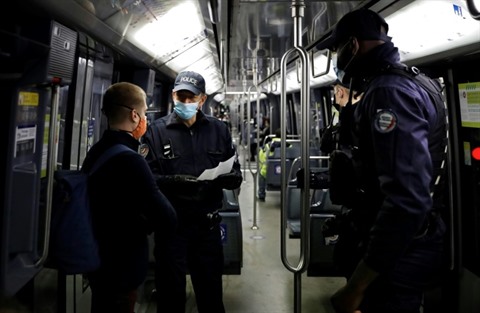 | Des policiers contrôlent l'attestation d'un voyageur pendant les heures de pointe dans le métro, le 15 mai à Paris. |