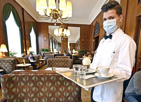 | Un serveur porte un masque de protection dans le grand café Landtmann de Vienne, le 15 mai. |