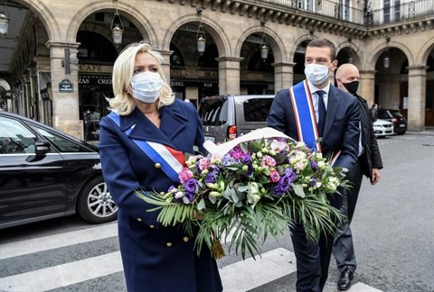| Marine Le Pen (RN) et Jordan Bardella, masqués, déposent une gerbe à la statue de Jeanne d'Arc, le 1er mai à Paris. |