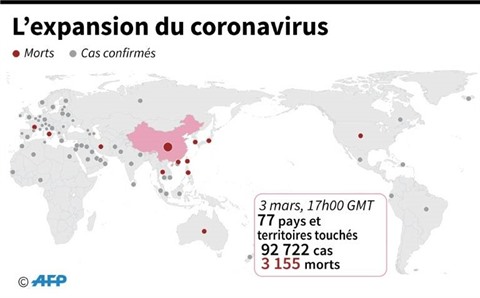 Le virus a contaminé plus de 92.000 personnes dans le monde et fait quelque 3.200 morts.