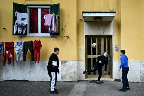 | Des jeunes du quartier de San Basilio à Rome jouent au ballon dans une cour d'immeuble, le 18 avril. |