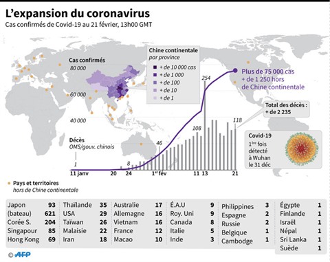 L'épidémie a déjà fait plus de 2.200 morts et a contaminé plus de 75.000 personnes en Chine et plus de 1.100 ailleurs dans le monde.
