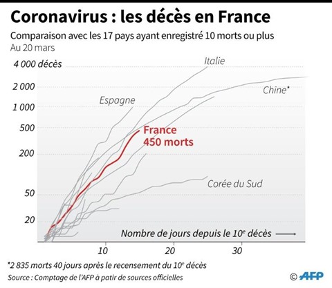 Selon les derniers chiffres du ministère, l'épidémie a causé la mort de 562 personnes, soit 112 de plus pour la journée de samedi 21 mars, et entraîné l'hospitalisation de 6.172 malades, dont 1.525 en réanimation (pour la moitié âgés de moins de 60 ans).